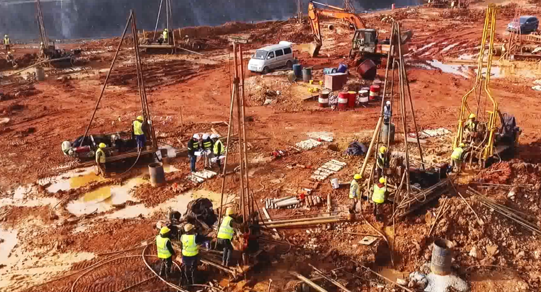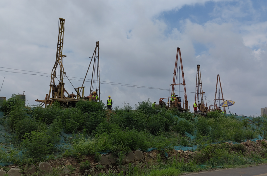 在施工勘察階段,根據(jù)業(yè)主要求,勘察需與施工同步進(jìn)行,彼時(shí)正值基坑開挖,作業(yè)面少,但項(xiàng)目任務(wù)重、時(shí)間緊。在接到業(yè)主進(jìn)場通知后,團(tuán)隊(duì)迅速召集了近百臺(tái)鉆機(jī)及相關(guān)作業(yè)人員,就作業(yè)面少問題,團(tuán)隊(duì)人員不斷與施工總包方溝通協(xié)調(diào)并制定施工、勘察方案,最終通過團(tuán)隊(duì)的拼搏努力及與總包方的密切配合,順利完成了施工勘察任務(wù)。