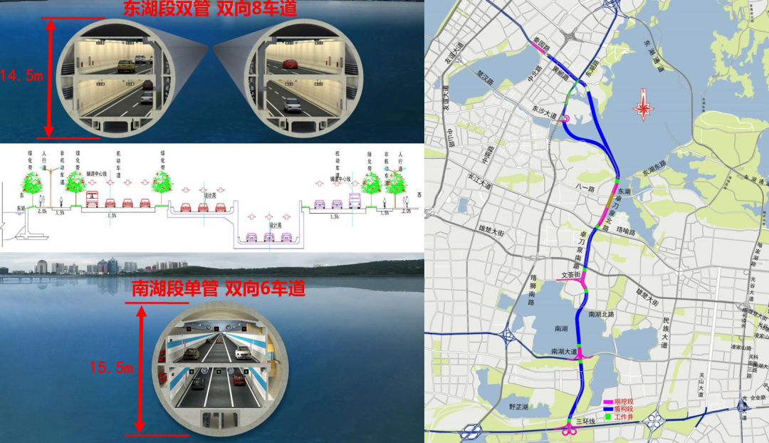 為更好地支撐城市空間發(fā)展,武漢市“十三五”規(guī)劃中要求“加大地下空間開發(fā)利用度,加強地下通道、地下停車場等地下交通設施建設,啟動實施‘負高架’工程,改善交通出行條件”。兩湖隧道作為世界上規(guī)模最大的城市湖底雙層超大直徑隧道,是武漢市重點市政工程,也是惠及武漢千家萬戶的重大民生工程。項目建成后,將在武昌片區(qū)形成一條南北向快速通道,可有效緩解二環(huán)線、珞獅南路、水果湖隧道等道路交通壓力,不斷完善區(qū)域路網體系,方便周邊地區(qū)居民出行。